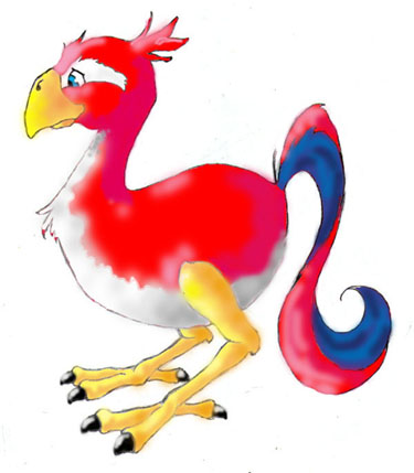 This bird like creature not only looks like a chicken, but it also has about the same intelligence level as one. In other words, they are stupid...very, very stupid. This incredible lack of brains is thought to be why they have such a short life span in the wild, on the average lasting two to three years at the most. In captivity this life span is usually increased by a few years, but in the end even the most careful owner usually loses the bakabir to some strange accident. It's size and strength make the bakabir perfect for farm work, standing at about seven feet tall and weighing in at around 250 pounds, the bakabir is used to carry heavy loads as well as plowing fields and any other assorted hard labor. Its' dull intellect makes it easily trainable and it's swift speed allows for quick and efficient work. The bakabir has long muscular legs that let it run long distances in a short amount of time even when carrying heavy loads, because of this they are also used for transportation by some. This becomes especially handy in the country where there are no real roads and the bakabir's steady pace and good footing make for an easy and comfortable ride. The bakabir lays an average of six eggs a year all at one time, these eggs are then abandoned and left to hatch on their own. The hatchlings arrive one month later and after breaking out of their shells immediately start out in search of other bakabir. The first herd they come across will be the one they live with the rest of their lives. Normally about two of the original six babies make it all the way to the point of finding a herd, the others are either killed or brought into captivity. Bakabir live in large herds of up to fifty and roam the grasslands and forests of Rima freely. Feeding off of the grasses and seeds of the wild, the bakabir spend most of their days grazing. It is a common sight to see the animals in the wild and they are under no threat of extinction. Although they are prized for their beautiful tail feathers and tasty meat, the population never seems to be hurt from hunting. Very social animals, the bakabir herds are often seen intermingled and no real territorial issues ever seem to come up with them, although it is plain to see that larger males are dominant over the smaller ones. Bakabir communicate by making low guttural noises, this is also how they tell herds apart because each herd has it's own distinct dialect. From this they can tell who is a member of their herd and who isn't, so even when mixed together no bakabir leaves with the wrong group.
