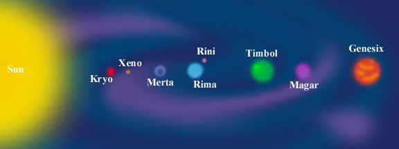 Timbol- The second largest planet, Timbol is made up entirely of different gasses. Although scientists have sent in expeditions and used all technology available to them, no surface has ever been found on Timbol. It is assumed that no life is there either due to lack of land.